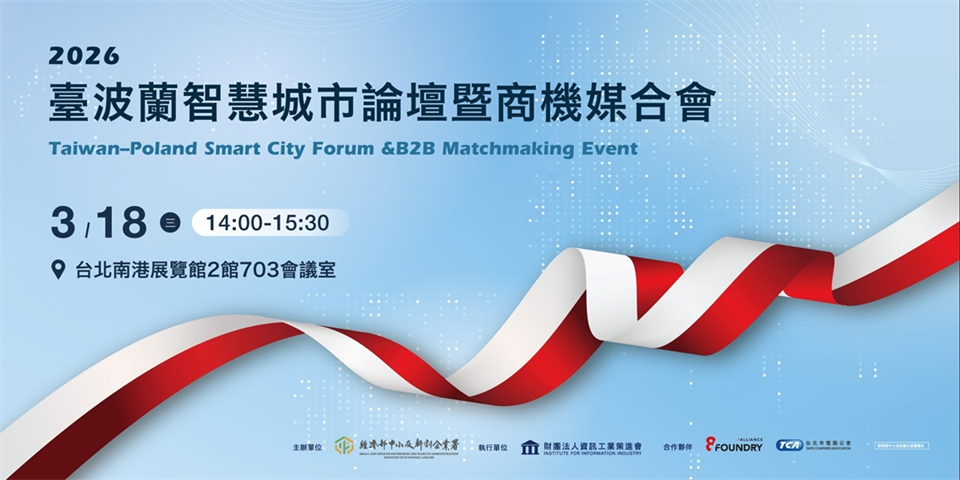 為推動臺灣與波蘭中小企業合作關係,拓展我國中小企業於歐洲市場的發展機會,特舉辦「2026臺波蘭智慧城市論壇暨商機媒合會」以協助波蘭企業與我國中小企業暨新創業者商機媒合及合作對接。...