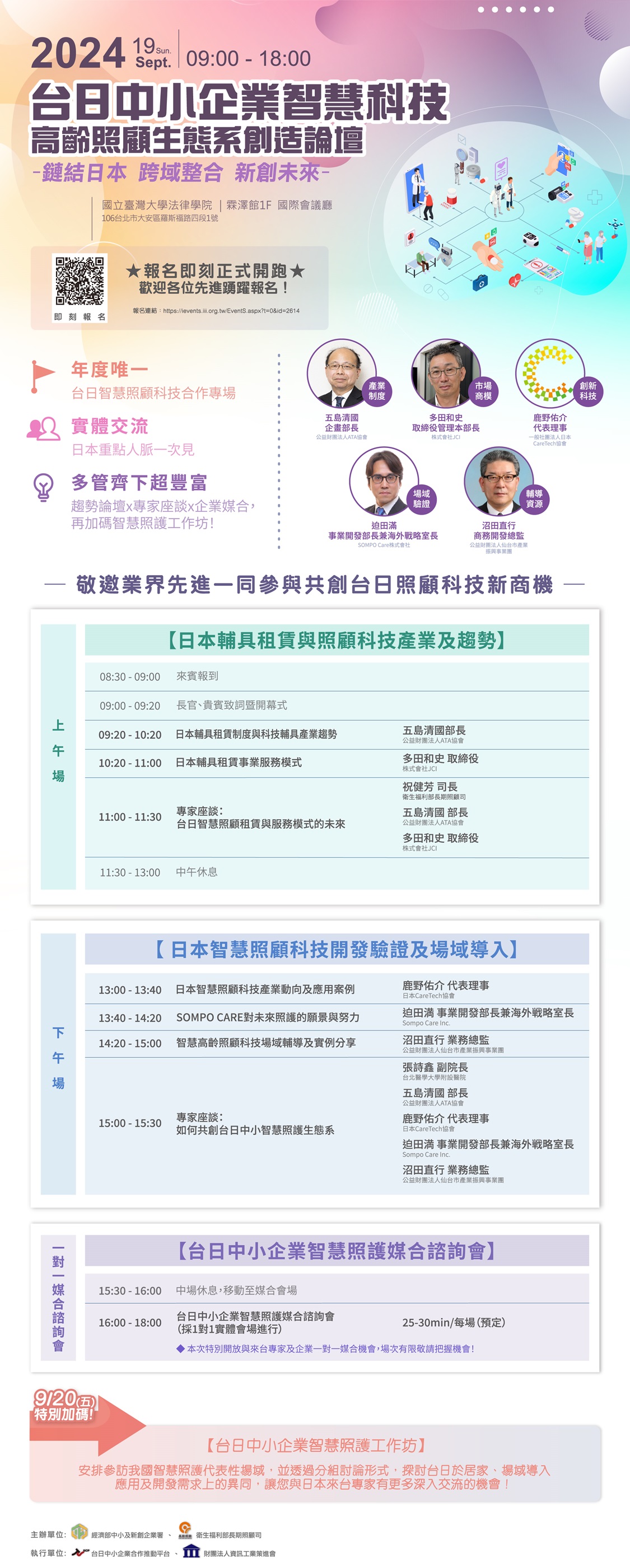 本次特別開放與本次來台所有專家日本公益財團法人ATA協會、株式會社JCI、日本CareTech協會、SOMPO CARE Inc(日本損保集團)、仙台市產業振興事業團、株式會社TREK等單位一對一諮詢媒合機會,場次有限,看到就報名!