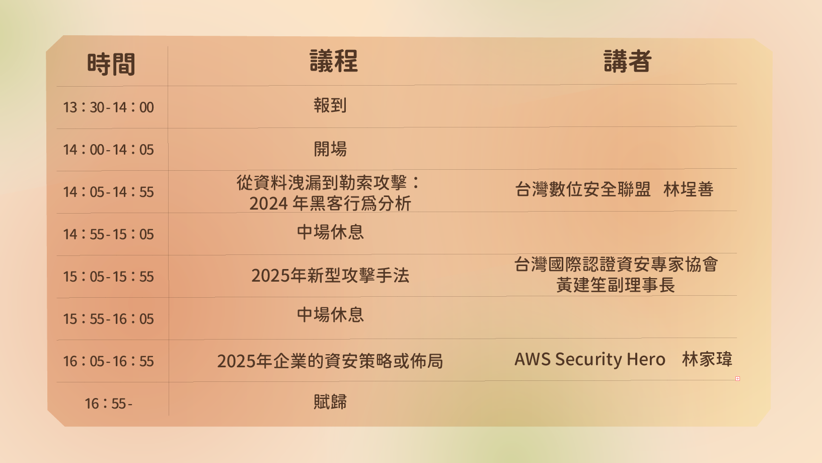 講座簡介:全球數位安全環境,隨著AI技術發展與數位轉型加速,正面臨前所未有的挑戰,攻擊模式變得更加精密且具組織性。資安防護已不再是單㇐企業的責任,而是整體產業生態的關鍵課題。透過本講座分享,除了內部強化資安機制,企業夥伴的共同防禦更是不可或缺,唯有透過全面性的聯防策略,才能有效降低風險,確保企業營運穩定,並提升整體數位韌性,以應對未來更嚴峻的安全挑戰。