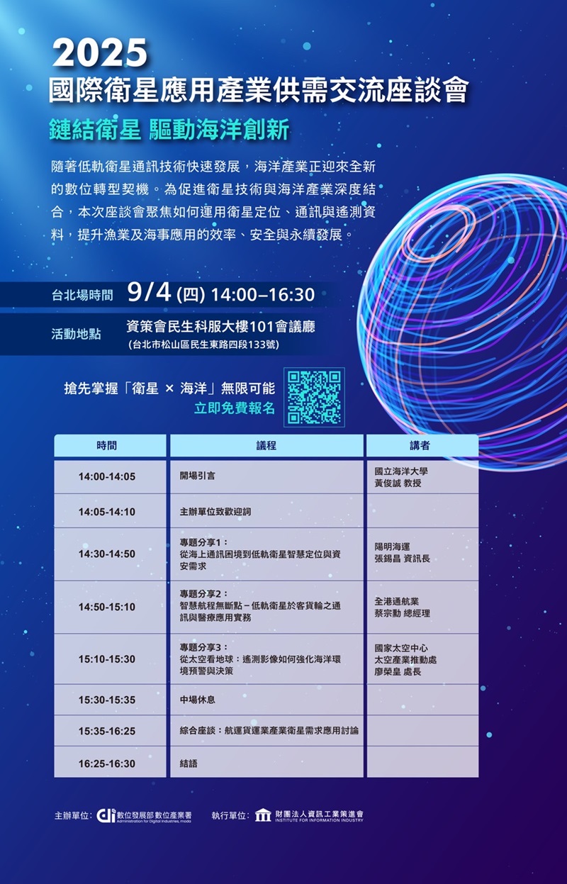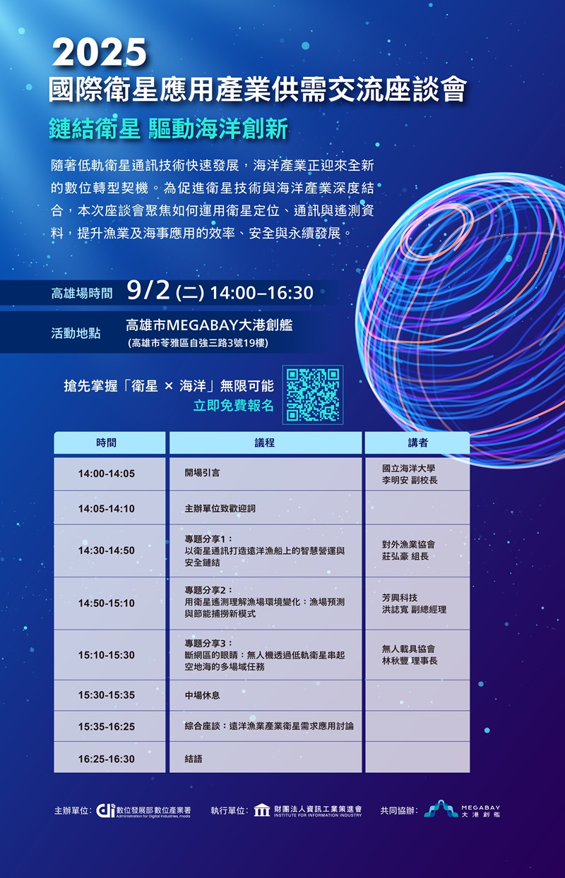 為促進衛星技術與海洋產業深度結合,本次座談會聚焦探討海洋產業通訊需求,將來能運用衛星定位、通訊與遙測資料,提升漁業及海事應用的效率、安全與永續發展。