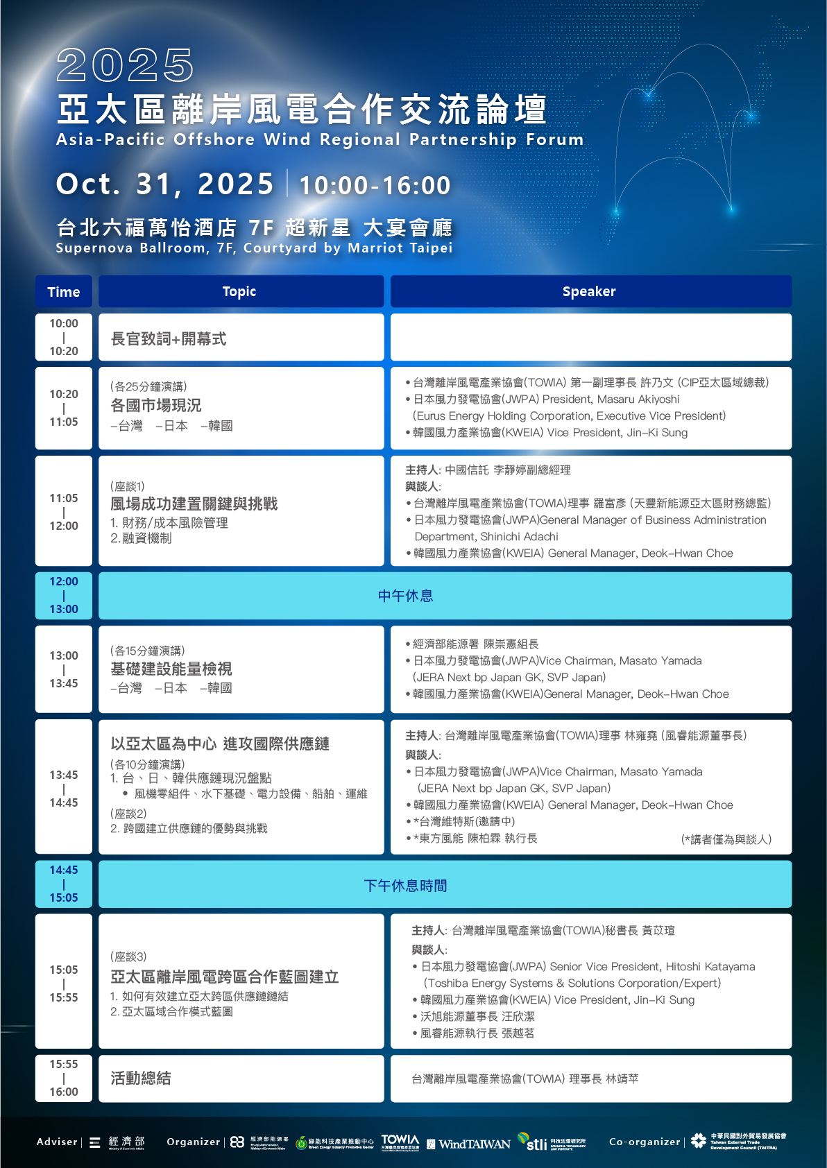 注意事項: ● 主辦單位保留議程調整、講者安排之權利,未規定事項依展覽館現場公布資訊為準。 ● 如有天災等不可抗力之事由,依當天活動所在地縣市政府(台北市)是否上班為準;若所在地宣佈停止上班,則活動停開,不再另行通知。 ● 為尊重智慧財產權,本活動所有產出資料,皆屬於主辦單位所有。 ● 議程將視情況滾動式調整,最新議程及講者簡介請見以下網頁為準:https://windtaiwan.com/ArticleView.aspx?ID=ART02216