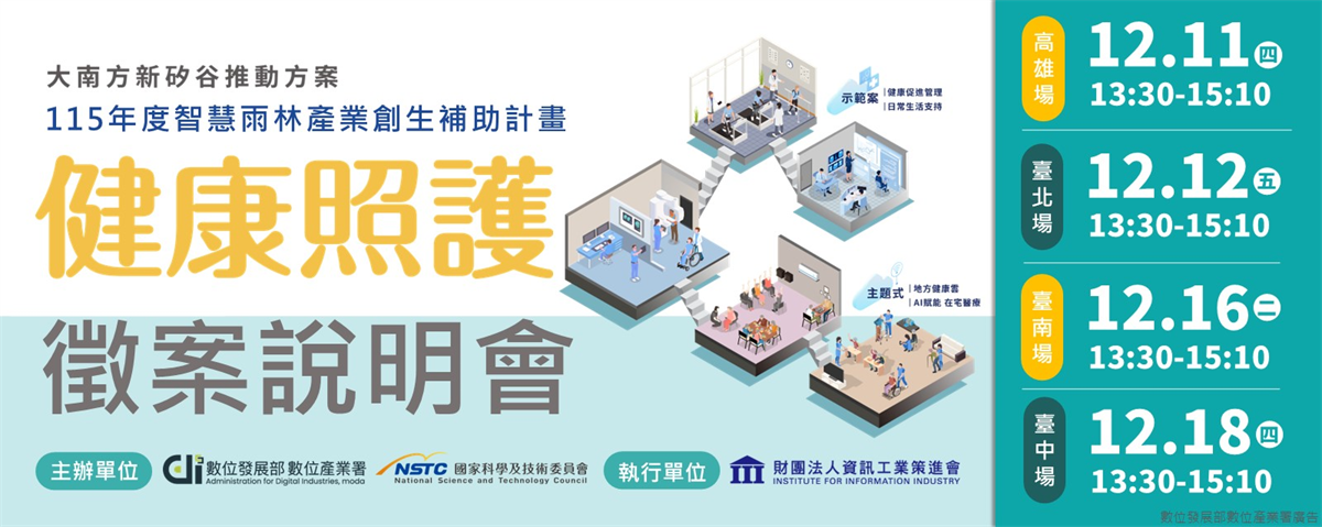 於明(115)年度辦理「智慧雨林產業創生補助計畫-健康照護領域」徵案,聚焦「健康照護產業」,透過補助方式協助資訊/電信服務業者、健康照護相關機構、大專校院等單位合作,配合大南方政策發展健康照護產業AI化,透過實證以導入符合產業需求的應用或服務,深化「AI產業化」與「產業AI化」雙軸發展,進而帶動大南方健康照護產業升級與經濟成長。