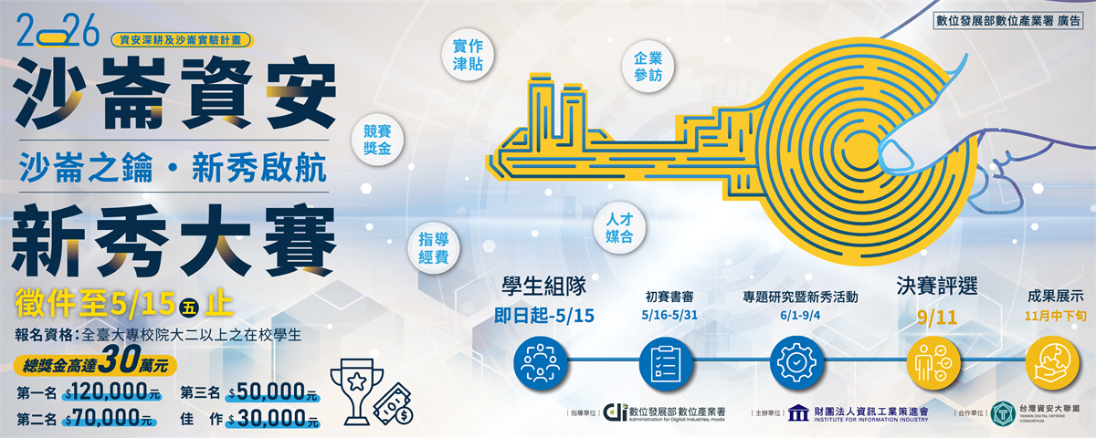 數位產業署為厚植資安產業實力,培養符合產業需求的人才投入資安應用領域,特辦理「2026沙崙資安新秀大賽」,鼓勵全臺大專校院的學生提出「資安應用解決方案」之實務專題並組隊參賽,藉由競賽活動協助產業預約具潛力的資安人才。