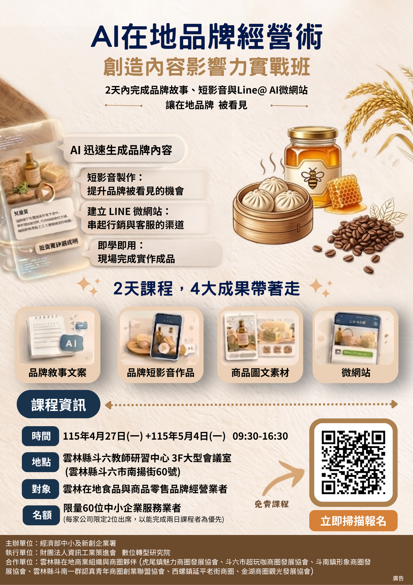 🌟本課程透過兩日實作,課程旨在協助雲林在地米糧、烘焙、食品、服飾等零售業者,透過結合AI 工具提升敘事深度與影像質感,提升企業品牌數位形象、降低營運負擔及實現品牌數位轉型。