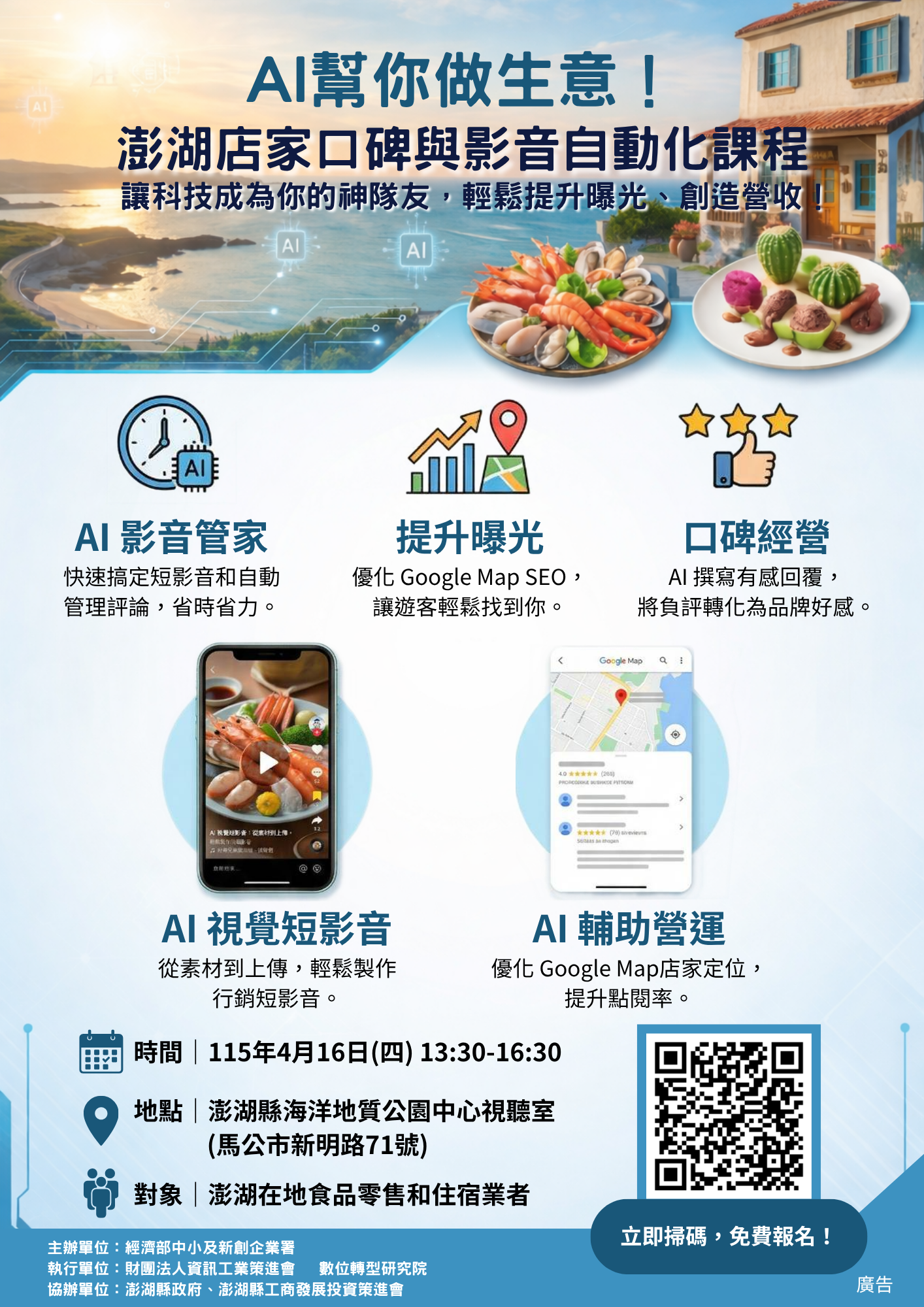 🌟本課程專為「澎湖特色產業(食品零售與住宿業)」量身打造。是透過實際操作,帶領您利用 AI 工具解決淡旺季人力調度與數位資源不足的挑戰,讓您的店面在搜尋引擎中脫穎而出。