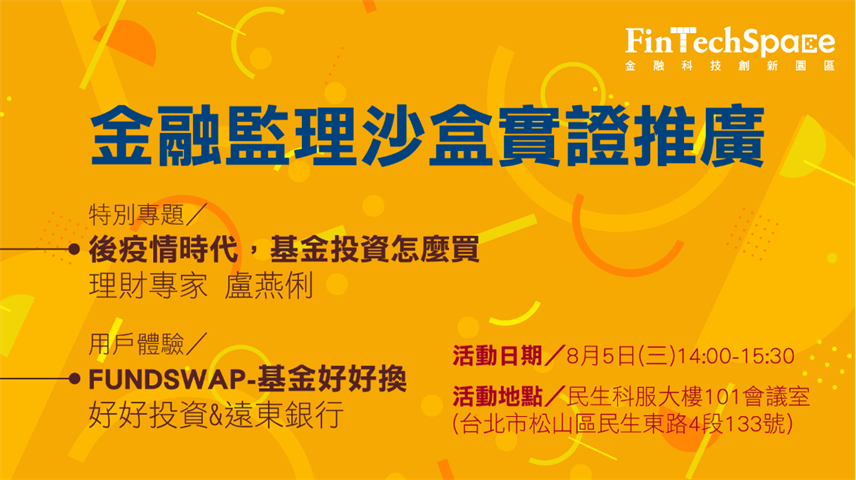 好好投資與遠東商銀,分別為園區進駐之新創公司與金融機構,透過園區之媒合與輔導,申請「新型態網路基金交換平台-FundSwap」亦獲准進金融監理沙盒。為加速創新實證落地,特將於民生科服大樓進行FundSwap-基金好好換之活動。