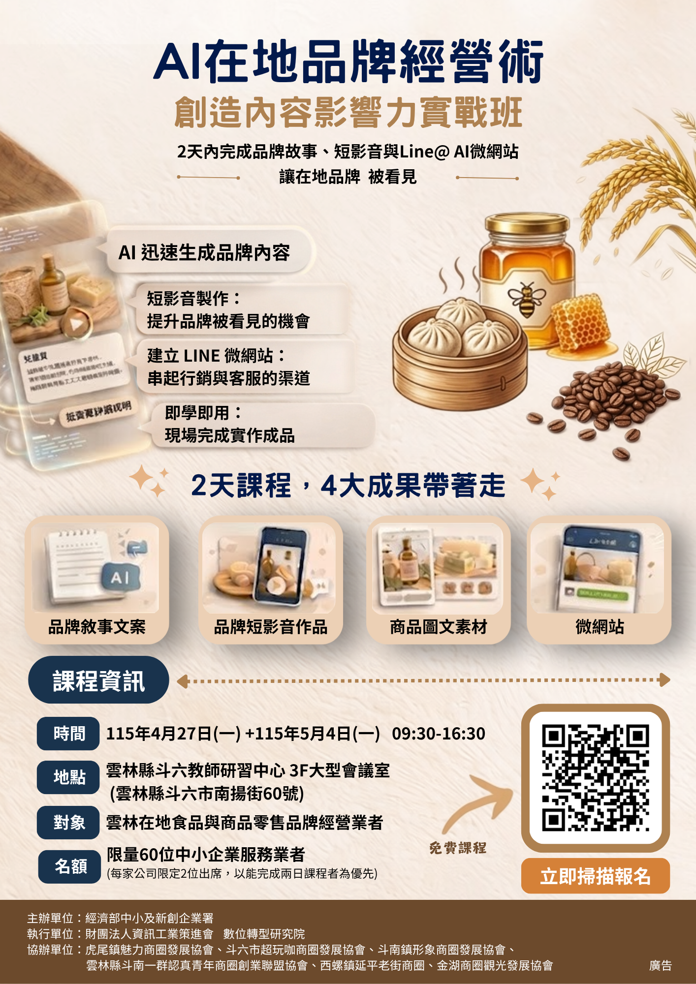 🚀AI在地品牌經營術:創造內容影響力實戰(4/27+ 5/4 兩日班)