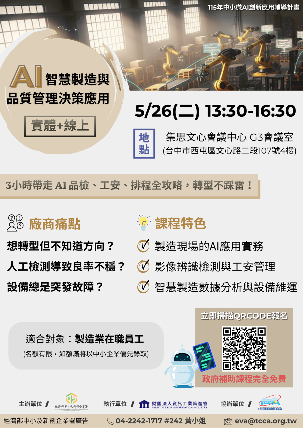為解決製造現場仰賴人工經驗、難以即時掌握異常的痛點,本課程聚焦AI影像辨識與數據分析的實務應用。從AOI自動光學檢測優化品質管理,到利用生產數據達成精準監控與設備維運,協助企業實現產線自動化與決策科學化。